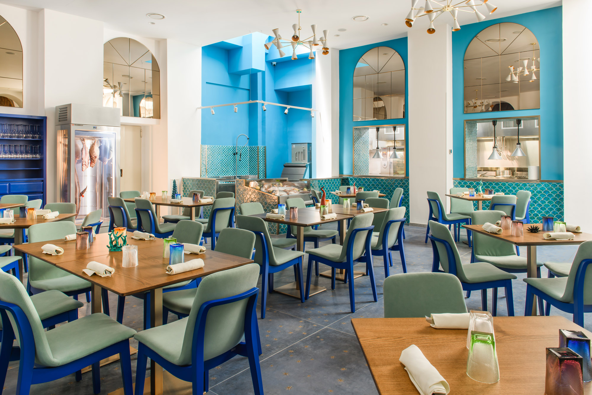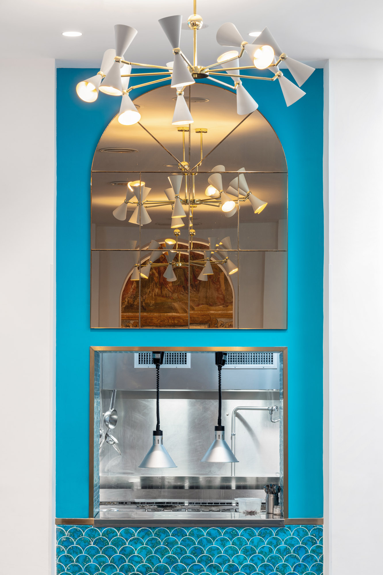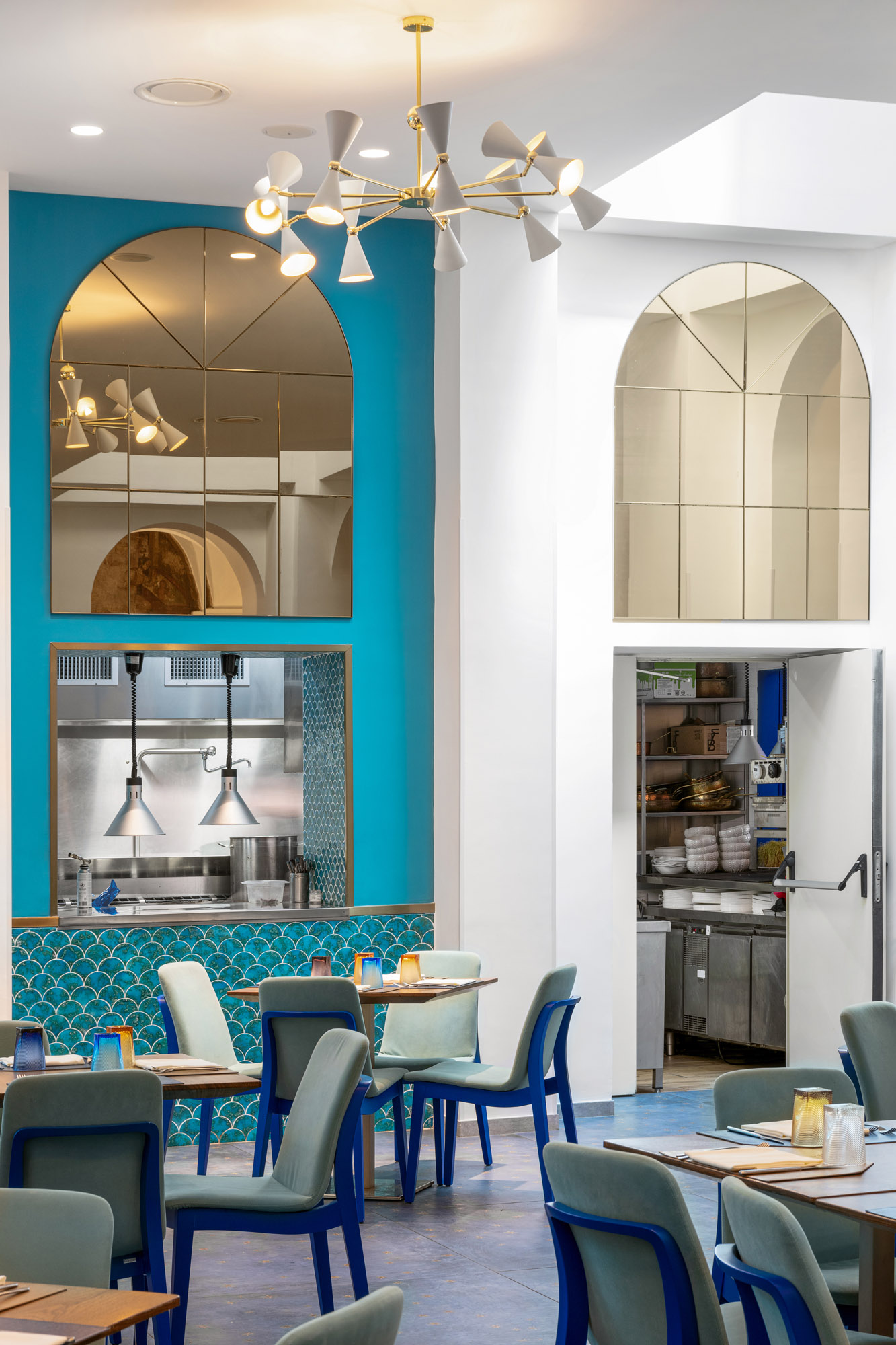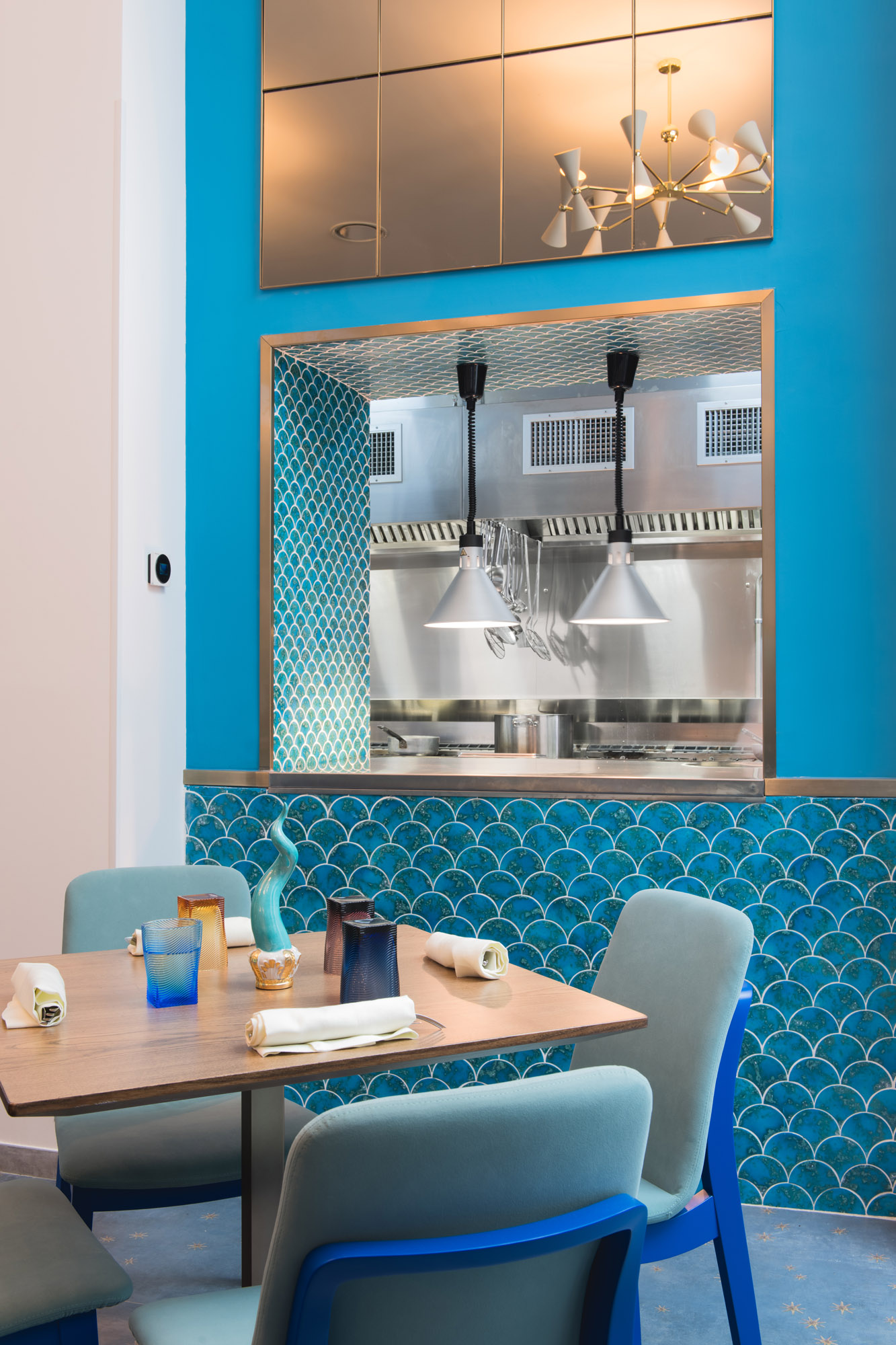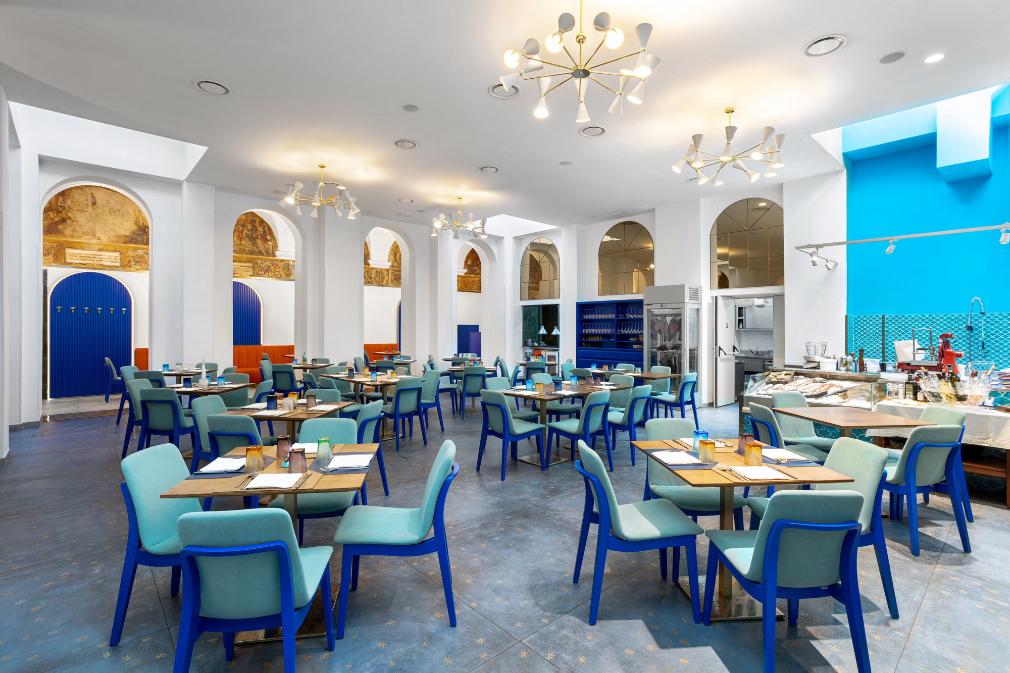 Gli arredi, tutti custom made, sono stati realizzati su progetto originale, al fine di soddisfare le esigenze dello “storage”, come utensili e hotellerie. Per definire nuovi ambienti prima non presenti in sala come area bar, area privè, cantina a vista, area pescheria/crudi e attrezzature di ultima generazione. Gli arredi artigianali e le rifiniture di pregio, sono stati pensati e realizzati anche per esaltare gli antichi affreschi e le volte di questo antico convento. Come le barre di ottone che “delimitano” il perimetro affrescato, e che al tempo stesso richiamano l’arredo, il lungo divano in velluto arancione e gli specchi a taglio. Questi ultimi, oltre a mostrare l’arte da ogni punto del locale, generano una profondità di campo unica nel suo genere. I colori, le forme e i materiali sono equilibrati e avvolgenti. Il tutto in sintonia e nel rispetto della struttura storica in cui ci troviamo. L’arte culinaria di “Al convento” è stata di ispirazione per la selezione dei rivestimenti, che in un incastro di geometrie e colori si rifanno al cielo stellato di Giotto, visibile sui pavimenti by Refin Ceramiche della collezione Affreschi presenti nell’area centrale della sala. Le squame di pesce di Pecchioli Firenze presenti nell’angolo cucina e nell’area crudi. Nell’area bar è stata realizzata una grande parete rinominata “deep blue wall” con tiles di Marazzi, richiamata anche nell’area braceria, dove i blu sfumano verso i verdi a creare un equilibrio in grado di far coesistere tutte le varie tonalità degli azzurri che seguono. Tra i pilastri della sala e le restanti aree del ristorante, la collezione Affreschi è separata da un gioco di strisce colorate realizzate in ceramica vietrese da un’azienda locale, la Solimene. L’illuminazione tecnica e quella scenografica, sono state studiate per valorizzare le volte e gli affreschi, oltre che a creare il giusto ambiente in sala, anche di notte, quando dal lucernario del convento non filtra piú la luce solare. La palette dai colori “marine”, che trae ispirazione dal borgo di Cetara, non è scontata. Infatti, la variazione dei blu, dal pavimento, ai rivestimenti delle varie aree è “esaltata” dagli arredi in blu cobalto, che ben si accosta all’ocra, all’arancio e all’ottone presenti nella restante parte del ristorante. Il progetto ha la replicabilità come “goal”, in vista della futura espansione del brand “Al convento” nel mondo. Il layout e l’interior design, cosí come il payoff “Casa Torrente”, sono stati ideati e progettati con lo scopo di trasmettere un’esperienza “familiare” ai clienti, ovunque essi siano.